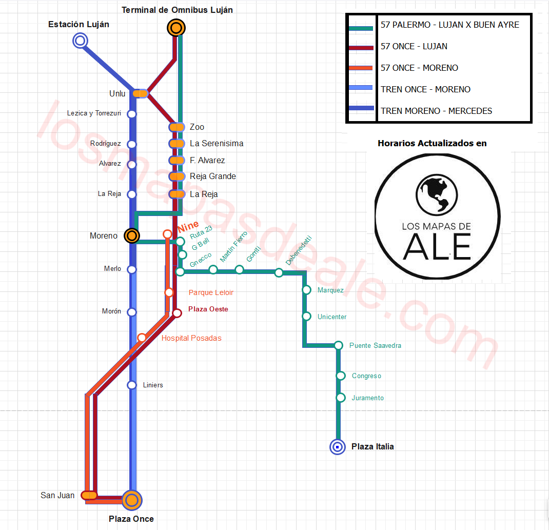 Esquema de Tranposte Público entre Buenos Aires y Luján. Principales Paradas del Ferrocarril Sarmiento Ramales (Once - Moreno y Moreno - Mercedes) y los 57 que van por Acceso Oeste entre Capital y Luján, 57 Once - Nine, 57 Palermo - Luján y 57 Once - Luján.