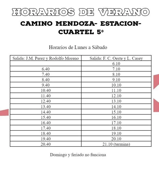 Horarios de lunes a viernes del Colectivo por Camino Mendoza.