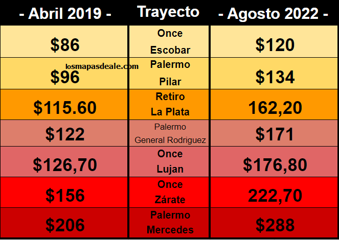 Mientras que de Palermo tiene un servicio por hora. Ir de Palermo a Mercedes costaba $206 y ahora son $288. Siendo la tarifa mas cara que se puede pagar con la Tarjeta Sube.