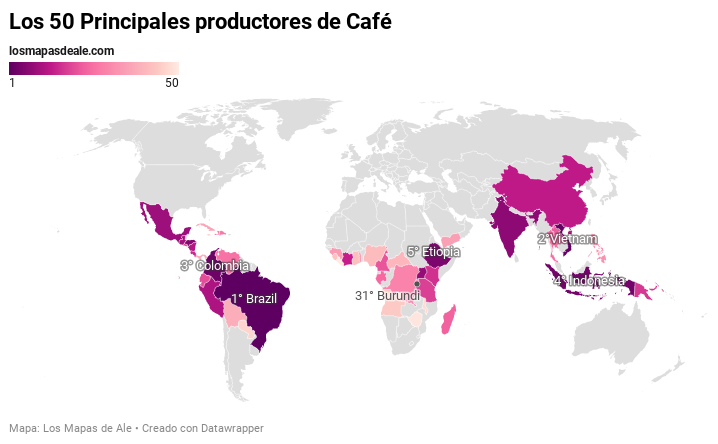 En color mas oscuro las primeras ubicaciones en el ranking de producción de café.