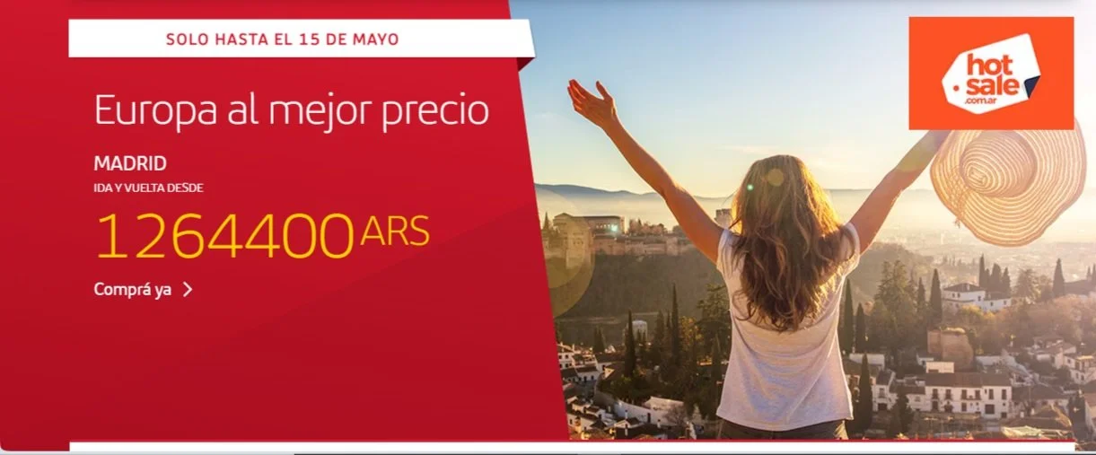 Ofrece cuotas 6 sin interes con casi todas las tarjetas, por lo que, no es un ofertón, pero encuadra en el mandamiento de que en un Hot Sale uno busca financiación. Así que si antes tu banco no te la ofrecía, es momento de emitir pasajes.