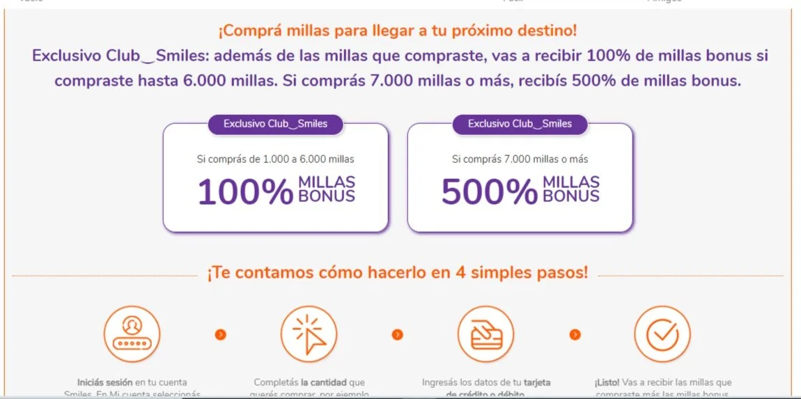Si ya sabiendo esto decidís introducirte en el programa de millas Smiles, la oferta mas importante es la que encontré en la imagen previa. 500% de millas bonus, a partir de la compra de 7.000 millas.
