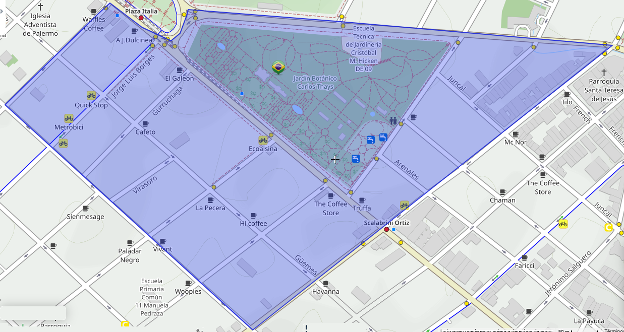 Se despliega alrededor de su corazón verde. Sus límites aproximados son el triángulo que parte desde Plaza Italia por Av. Santa Fe, Av. Las Heras y Av. Scalabrini Ortiz.